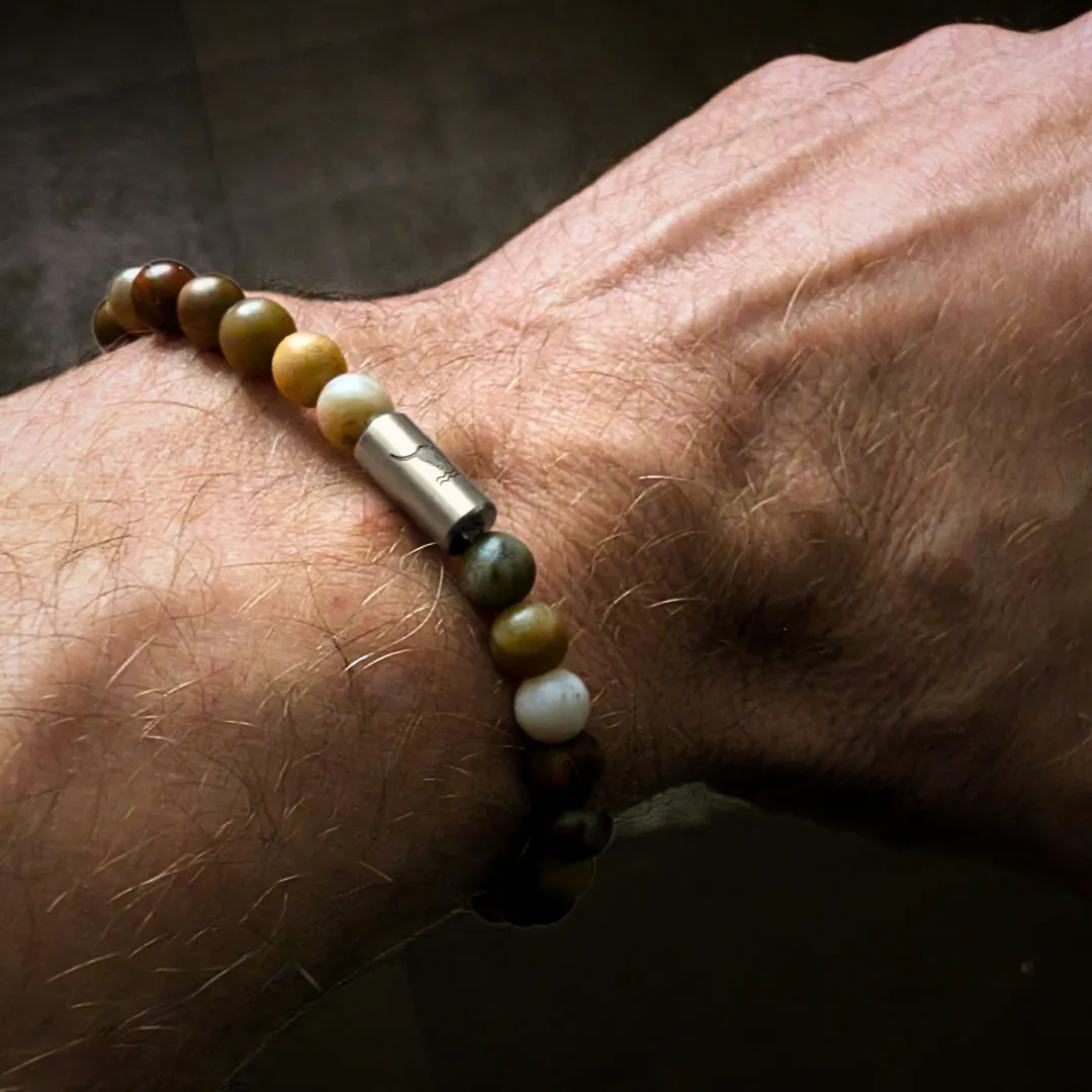 Armbandperlen aus echtem versteinertem Holz. Jede Perle ist Millionen Jahre alt. Ihr Aussehen und ihre Struktur erinnert an Planeten. Jeder Stein an Deinem Armband ist ein einzigartiges Unikat und gibt es so nur einmal.